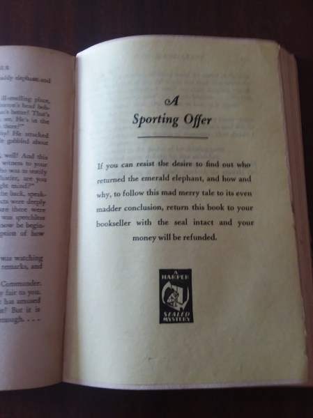 A note on my book’s edition: it dates from 1934, and at that time Harper apparently put out a series of ‘sealed mysteries’–until you broke the seal, you couldn’t finish reading the story, and if you decided to bail out you could (theoretically, at least) return the book for a full refund. Here’s the challenge page from my book: